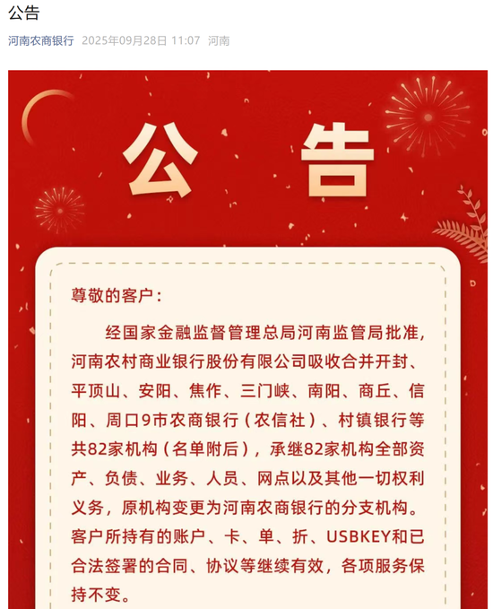 同在2025年2月,河南农商银行发布公告称,经国度金融监督治理总局批准,河南农村买卖相关银行和郑州、新乡、濮阳、济源4市农商银行(农信社)、荥阳利丰村镇银行等共25家机构,以新设肃清形状组建为河南农商银行。